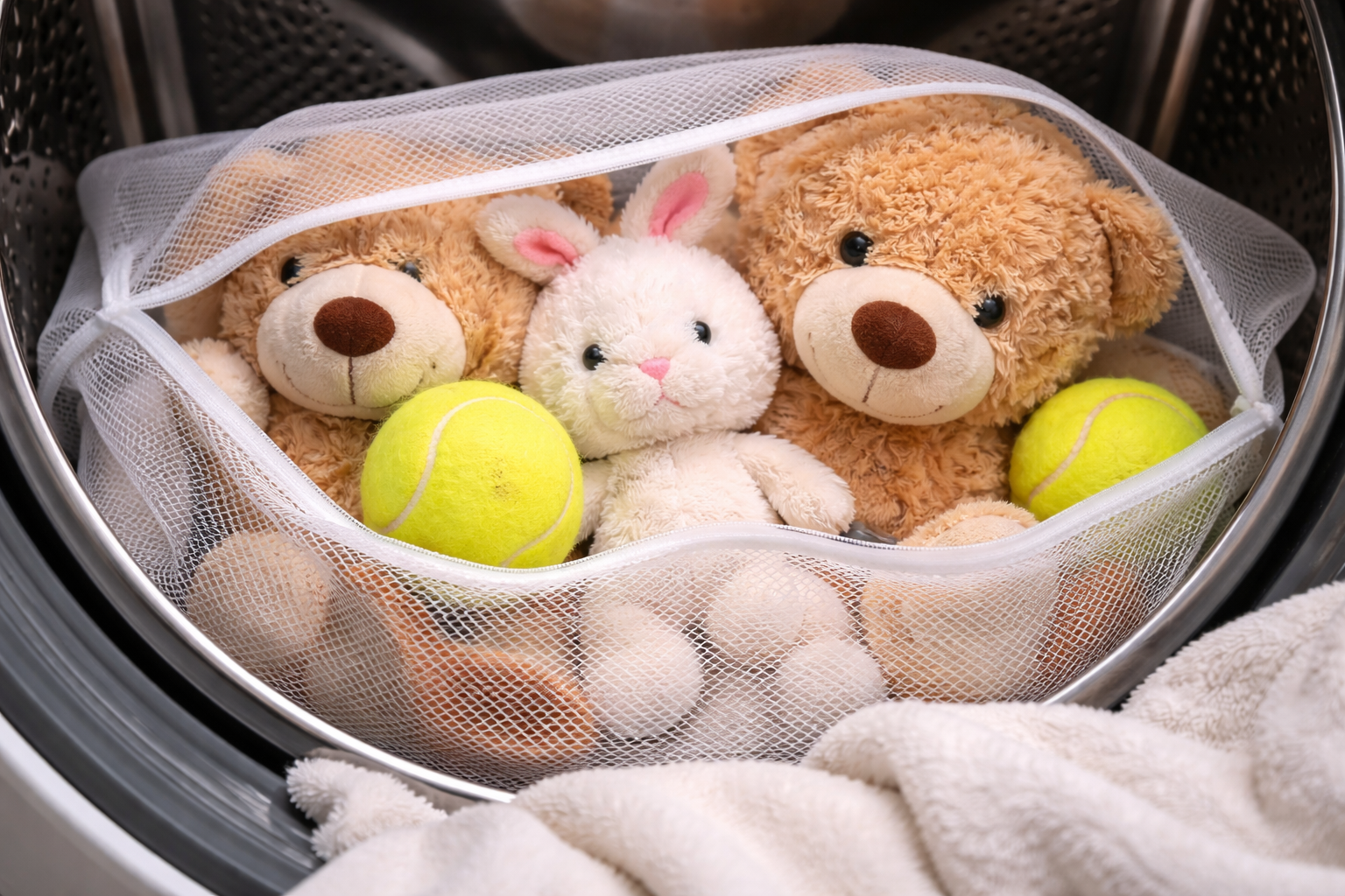 Tajná nuansa: Predtým, ako pošlete mäkké zvieratká do práčky, vložte ich do hustého sieťového vrecka a do bubna pridajte niekoľko tenisových loptičiek – zabráni to zhŕňaniu synteponu a zachová ich tvar.