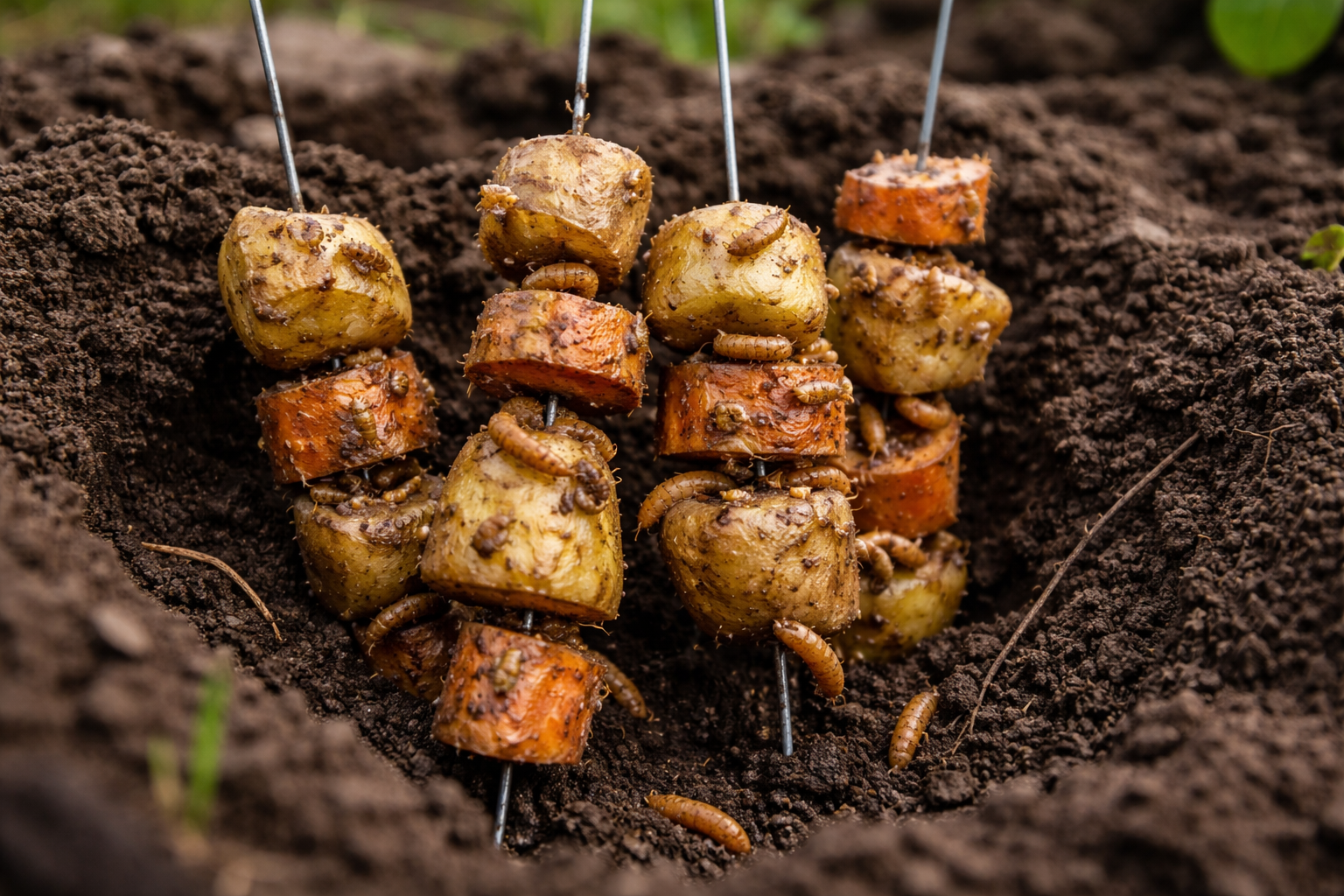 Hneď ako sa pôda začne otepľovať, drôtovec prebudí sa s obrovskou chuťou do jedla. Vtedy je škodca najzraniteľnejší a my môžeme hrať na jeho potrebu potravy. Namiesto toho, aby sme čakali, kým sa larvy dostanú k mladým rastlinám, kŕmime ich skôr.