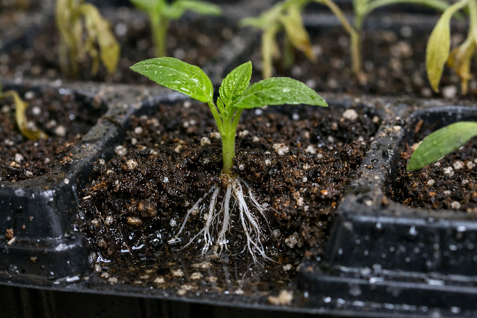 Keď semienka klíčia doma, v hustej pôde pre sadenice im katastrofálne chýba kyslík. Obvykle peroxid vodíka pôsobí ako silný prevzdušňovač a prírodný stimulátor. Keď sa dostane do pôdy, okamžite sa rozkladá na vodu a atómový kyslíkktorý čistí pôdu od patogénov a je okamžite absorbovaný mladými koreňmi.