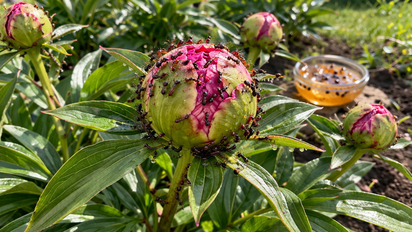 Počas obdobia aktívneho jarného rastu uvoľňujú rastliny veľké množstvo sacharidov. Hlavný dôvod výskytu nezvaných hostí spočíva v tom, že pivonky vytvárajú husté sladký nektár priamo na zatvorených púčikoch. Tento sirup pôsobí ako magnet pre hmyz, ktorý si chce doplniť energetické zásoby po dlhej zime. Sami o sebe sa len zriedkavo prehryzú cez okvetné lístky, ale ich prítomnosť často sprevádza výskyt mšicektoré spôsobujú skutočné škody na mladých výhonkoch.