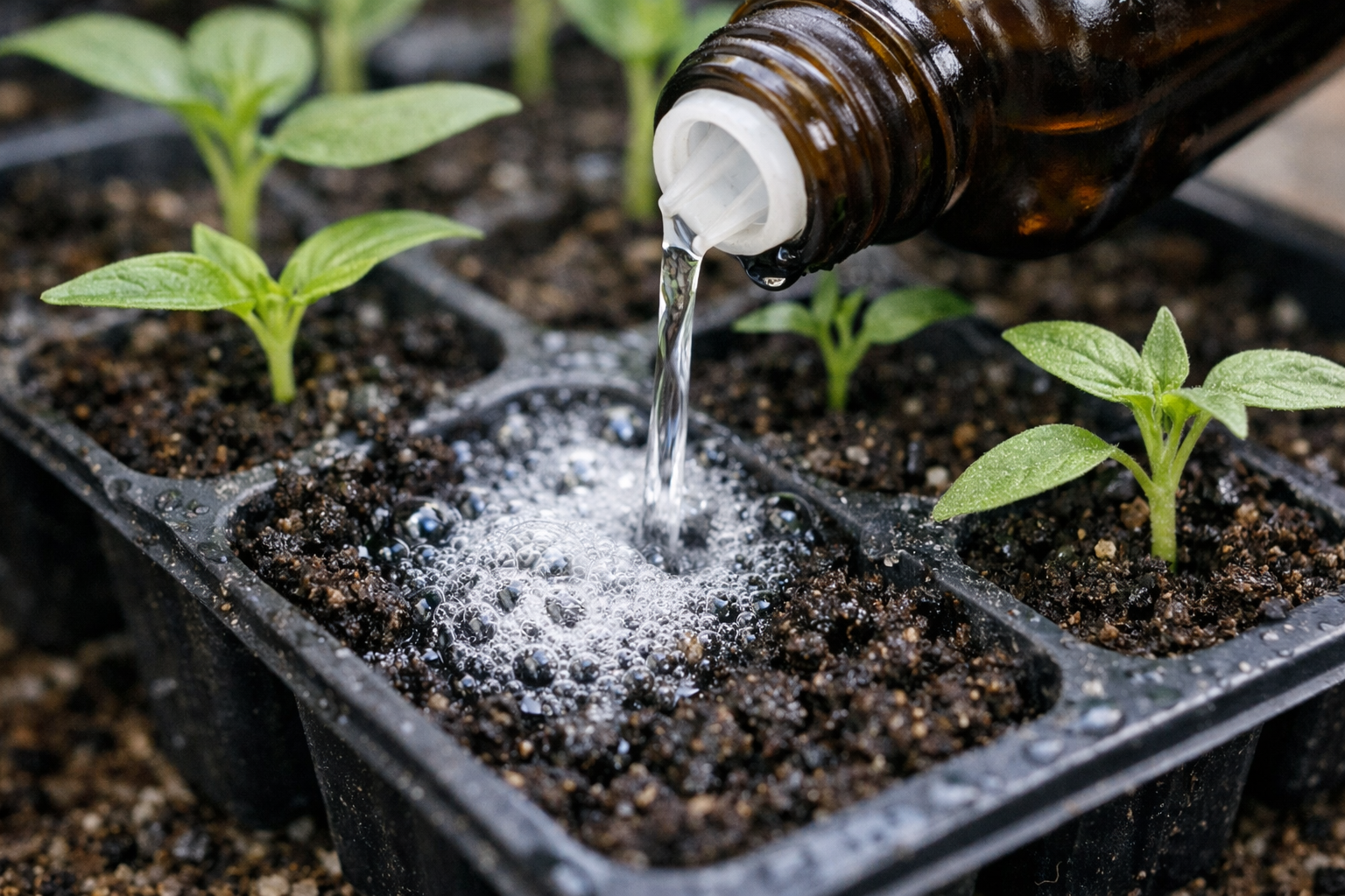 Pri zalievaní je dôležité dodržiavať striedmosť. Hoci peroxid vodíka je mimoriadne užitočný, substrát by sa nemal stať bažinou. Ku koreňom by sa mal dodávať kyslík, a nie vytláčať všetku vlhkosť z pórov pôdy.