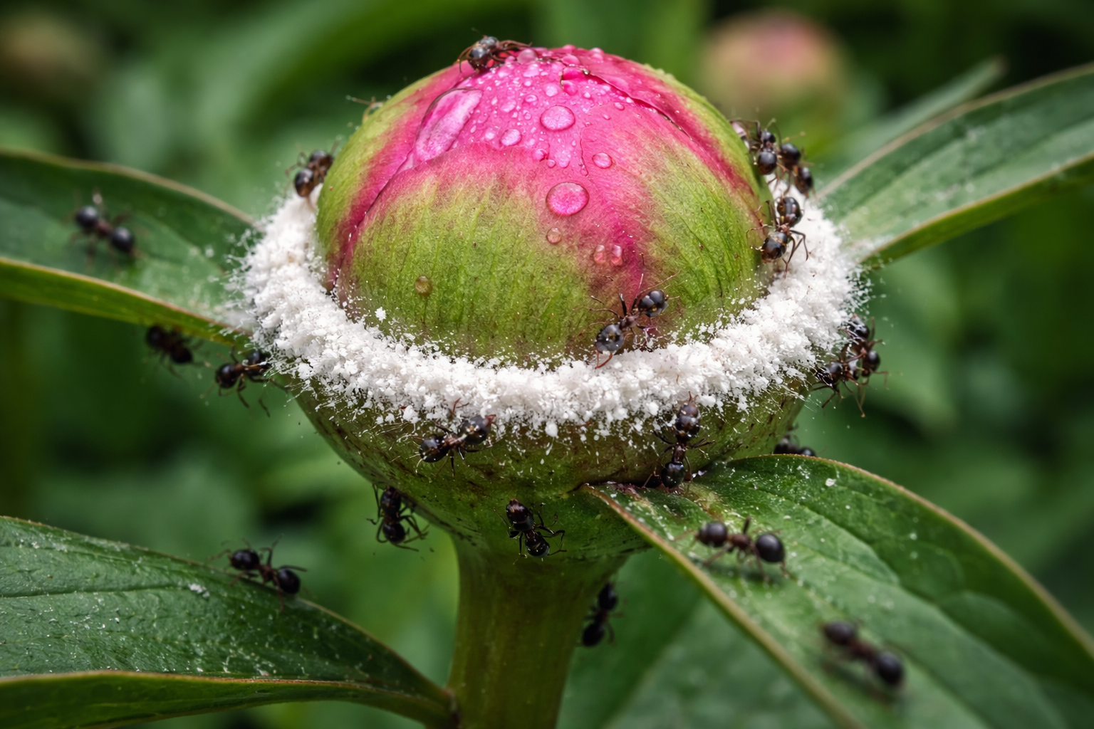 Mravce nežerú okvetné lístky a listy, priťahuje ich len výživný sirup, ale môžu zavlečieť mšice alebo poškodiť vrchnú vrstvu púčika a spôsobiť jeho deformáciu.