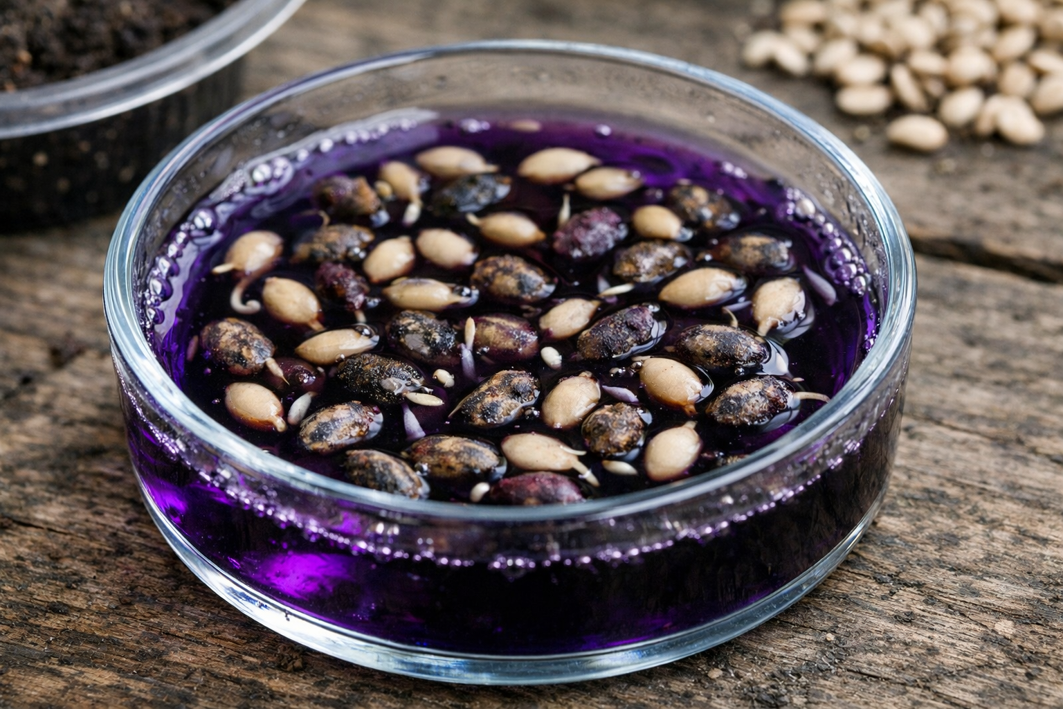 Semená vždy opláchnite čistou tečúcou vodou ihneď po ich vybratí z roztoku, inak môžu zvyšky silného oxidačného činidla vážne poškodiť jemné zárodky pri ich klíčení.