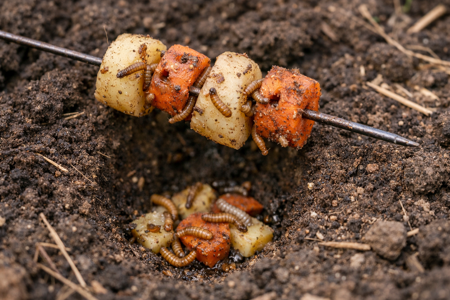 Na vytvorenie účinnej pasce stačí nakrájať staré zemiaky alebo mrkvu na veľké kusy. Tie by sa mali navliecť na drôt a zakopať desať až pätnásť centimetrov hlboko v rôznych častiach zeleninovej záhrady.