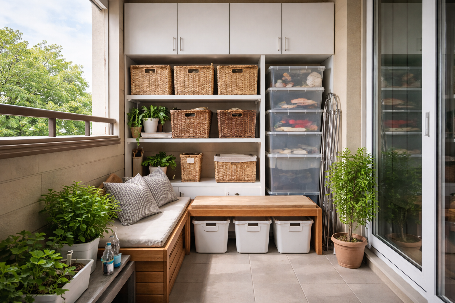 Hlavné tajomstvo poriadku: balkón často preberá úlohu „tranzitnej zóny“, preto je dôležité zabrániť tomu, aby sa tam dostali veci bez konkrétneho účelu, a používať prísne pravidlo „jedna vec dnu, jedna von“.
