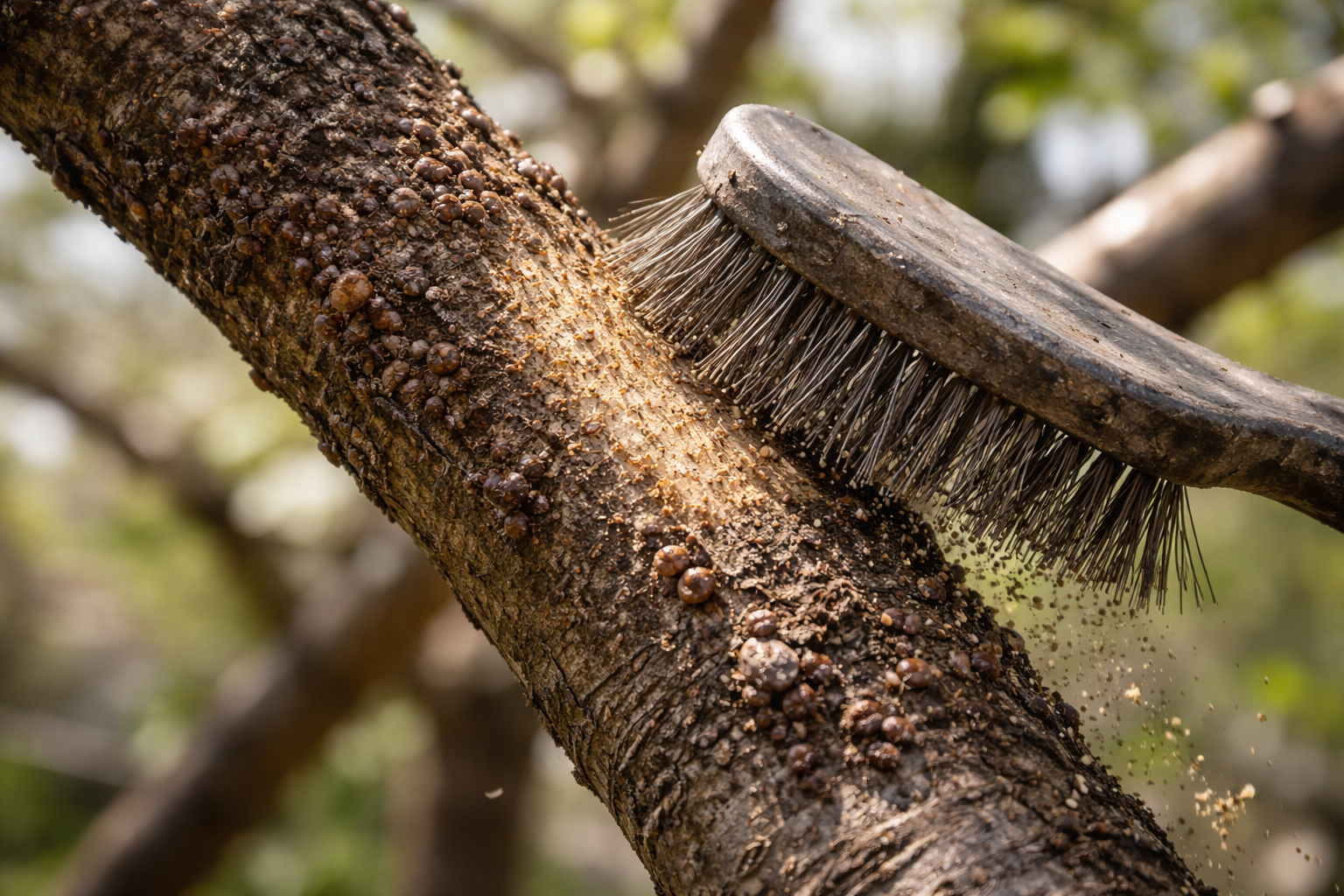 Prvá vec, ktorú vždy robím, je kontrola a mechanické čistenie. Na to používam stredne tvrdú kefku s kovovými štetinami alebo obyčajnú kefku na burinu. Dôležité je jemne očistiť výrastky bez poškodenia živej kôry.