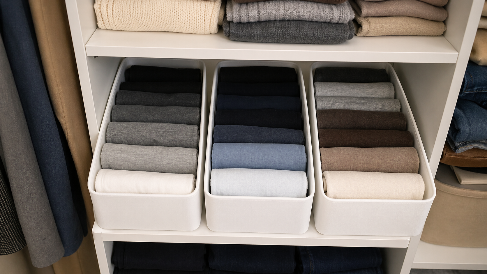 Jednofarebné úložné boxy v neutrálnych odtieňoch